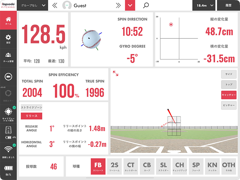 - トラッキングシステムによる球速、回転数、投球軌道の計測